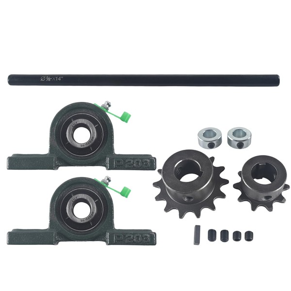 Package Include: 1 * 5/8"" by 14"" Jackshaft + 2 * 5/8"" UCP202-10 Mounted Pillow Block Bearings + 2 * 5/8"" Bore Shaft Collars + 1 * 14 Tooth 5/8"" ID #35 Sprocket + 1 * 10 Tooth 5/8"" ID Sprocket with built in Key + 1 * 3/16"" Keyway + 4 * screws