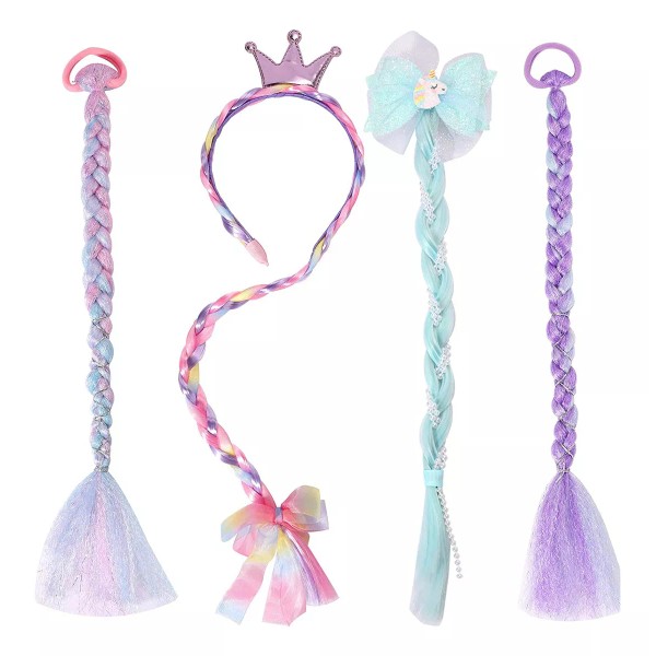 DISEÑO ÚNICO: 3 piezas de diferentes estilos de peinados de unicornio, cola de caballo. peluca de unicornio verde púrpura bling bling peluca. Peluca trenzada para niñas, lustrosa y divertida. Se muestra como en la imagen.; SEGURO Y A LA MODA: ofrece 3 lazos para el cabello para niños diferentes con un estilo diferente, deje que su niña se vista fácilmente. La cuerda para el cabello no dañará el cabello de su hijo, asegúrese de que su niña use extensiones elegantes y duraderas todo el día sin ningún riesgo. ; MATERIA--Longitud--Compuesto de materiales de fibra sintética seguros para niños, elasticidad ajustable.; MEMORIAS DE AMOR: adecuado para usos múltiples, combinación perfecta para varios disfraces de princesas como Ariel, Aurora, Bella, Cenicienta, Jasmine, Elsa, Rapunzel y Blancanieves para truco o trato de Halloween, fiesta de cumpleaños con tema de princesa, carnavales, actividades de disfraces y obras de teatro escolares, fiesta de té, caja de tesoros y más.; SERVICIO AL CLIENTE: si tiene alguna pregunta sobre el producto, comuníquese con nosotros, haremos todo lo posible para ayudarlo primero. Todos nuestros productos estan en inglés SKU 91122096656