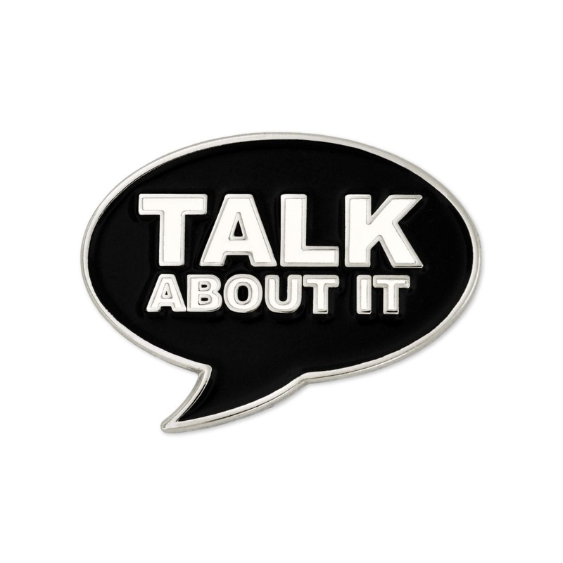 - Let's talk about it! Our Talk About It word bubble pin is a great way to encourage others that need support in Mental Health, Domestic Violence and so many other awareness causes. This pin is die struck from a fine jewelry metal, soft enamel color filled and is plated in silver.