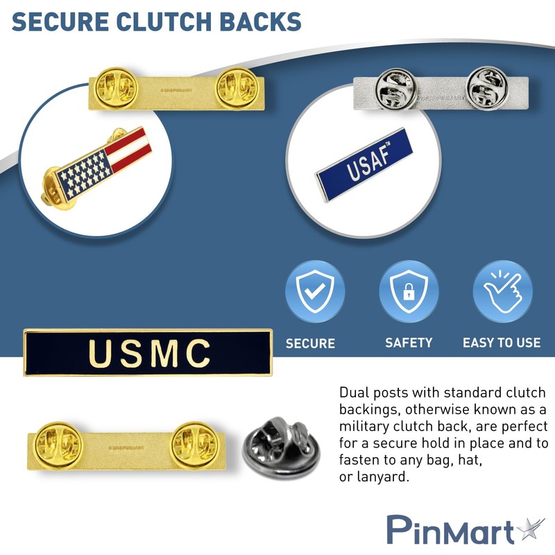- SECURE CLUTCH BACKS: Dual posts with standard clutch backings, otherwise known as a military clutch back, are perfect for a secure hold in place and fasten to any bag, hat, or lanyard