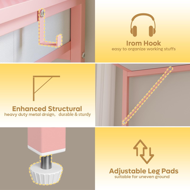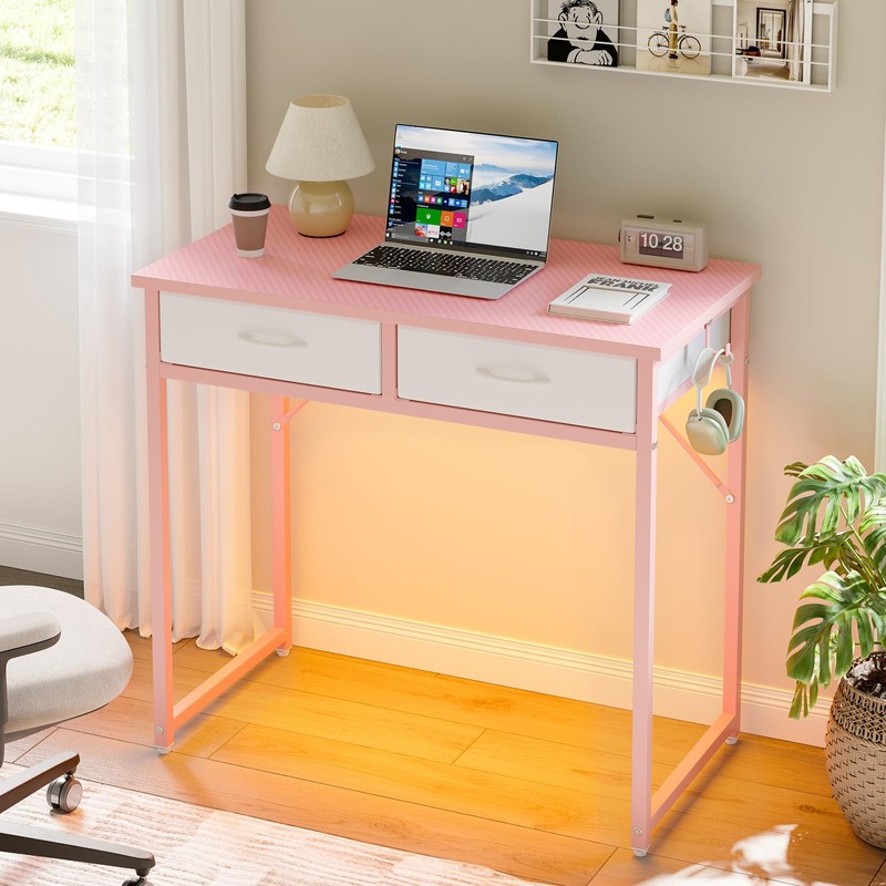 Pinmoco Small Desk with 2 Fabric Storage Drawers, Vanity Desk with Hooks, Home Office Computer Desk, Study Writing Desk for Bedroom Small Spaces, Adjustable Feet, Pink