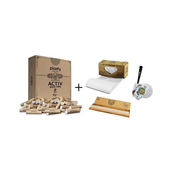 PINOFY Activated Carbon Filter Set | 200 Activated Carbon Tips Slim 6 mm + Papers | Roll & Long Papers Unbleached | Coconut Charcoal Pre-Rolled Active Filter | Brown Screw-In Filter Tips Extra