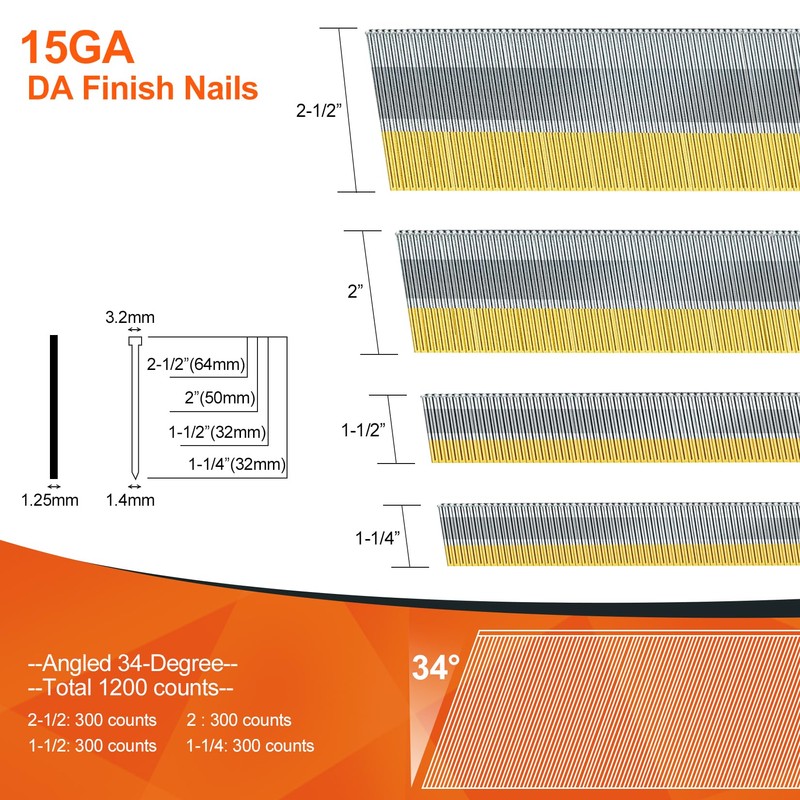- 【WHAT YOU GET】- Including 4 different sizes of angled DA nails: 2-1/2 inch-300, 2 inch-300, 1-1/2 inch-300 and 1-1/4 inch-300, which will meet most your project needs.
