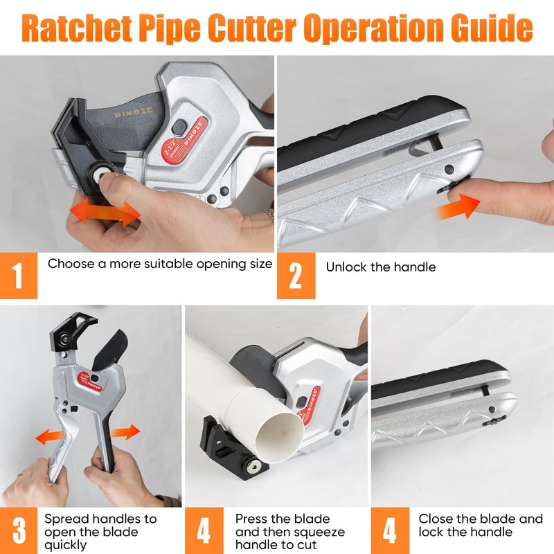 - [Heavy-duty & Quality] - The PINOZE PVC pipe cutter is made of durable hardness die-cast aluminum and includes a wear-resistant SK5 blade with Teflon coating; The V-blade design allows the tube cutter to penetrate the pipe more easily and more accurately, causing less damage and making a clean cut; Better for heavy-duty use