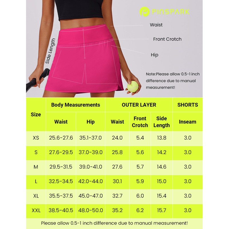 - Multiple Pockets: PINSPARK womens golf skort has an inner pocket in the short and a back zipper pocket. The inner pocket holds tennis/golf balls and cell phone. The zip pocket stores your keys, cash and cards.