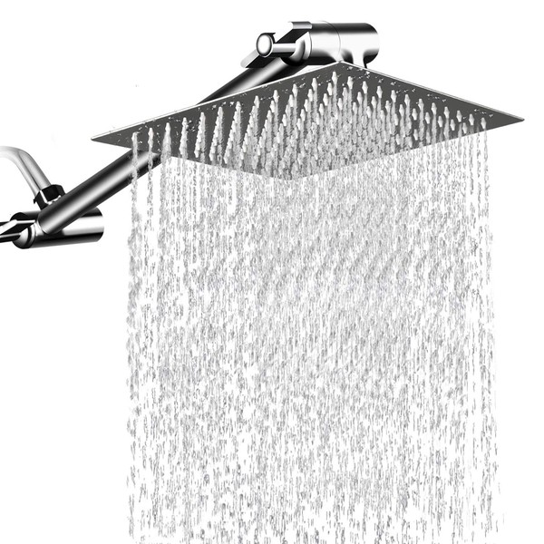 **This is our modern high pressure luxury stainless steel rain square shower head with 11 inch Adjustable Extension Arm.** **It is perfect for you bathroom.** **With it you could have a wonderful bath since the rainfall.** **Features:** **No Tool Installation:** Remove the original one and install the shower head with hands, no tool is required. The whole process spends few minutes. **No clogging and dripping:** Flexible silicone nozzles stop lime scale from sticking which prevents the holes from getting blocked and dripping. **Premium Material:** 100% High quality stainless steel, PVD multi-layer plating process, let the shower head glossy and smooth mirror-like and easy cleaning, as well as super anti- corrosion and anti-oxidation performance. The thickened joint is to prevent breakage, and the filter gasket ensures secondary filtration to keep your health. **Rotating Connector:** The swivel ball design in connector allows to adjust the angle of the shower head in 360°, let you have a variety of shower experiences. **Ultra-thin Design and Advanced Air Booster Technology:** Double pressure boost from thickness and air-pushing offer consistent powerful rainfall shower experience even under low water pressure. **Specification:** Material: 304 Stainless steel Body Function: bath shower head Shower head: waterfall style Shape: Square Size: 12*12 inches Thickness: 0.08 inch Connection: stand 1/2'' Weight: 3.4 Pounds Color: silver **Package included:** 12 inch Square Shower Head*1 11 inch Shower Head Arm*1 Extra Pipe Sealant Tape*1 Extra Filters*1 User Manual*1