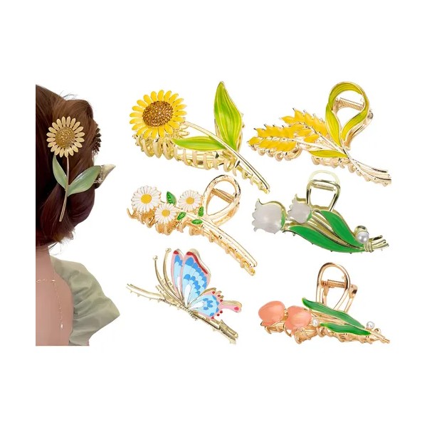 Concepto de diseño de pinzas para el cabello de metal: inspirado en girasoles, trigo, margaritas, lirios del valle, mariposas, tulipanes, etc. La fuente del diseño de 6 formas de flores diferentes proviene de la vida cotidiana. La pinza para el cabello de metal está hecha de un lujoso color dorado, se ve vivaz y delicada, puede combinar con cualquier color de cabello y cualquier estilo de uso.