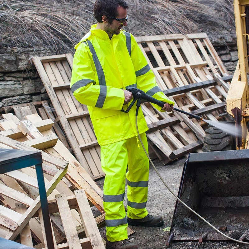 Pioneer High Visibility Rain Gear Safety Jacket and Bib Pants – Hi Vis, Waterproof, Reflective PVC Work Suit for Men – Orange and Yellow/Green