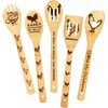 - 5 - Piece Utensil Kit : These novelty wooden spoons kit includes 5 different utensils: soup spoon, slotted spoon, slotted spatula, single hole spatula, forked spoon. Each has a hole for easy hanging, meeting all your cooking needs.