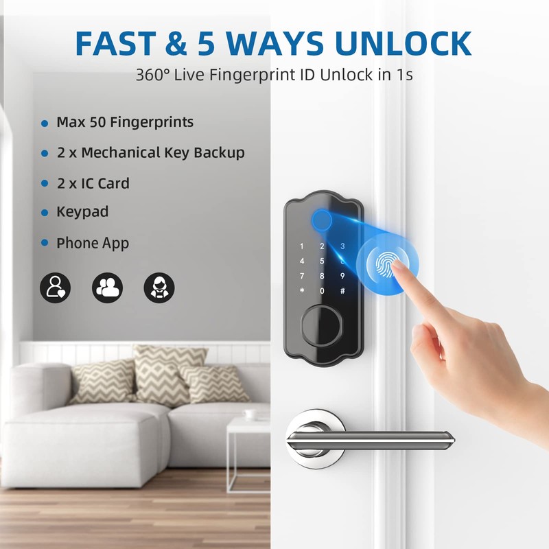 • 6 in 1 Great Solution for Your Home - This smart lock can not only complete the basic task of guarding your security but also completely solve your door lock needs in different scenarios, whether it is a good choice for your house or Airbnb home hotel. 6 ways to unlock your door - Keypad, Fingerprint, IC Card, Voice Control, Phone APP, and Mechanical Keys