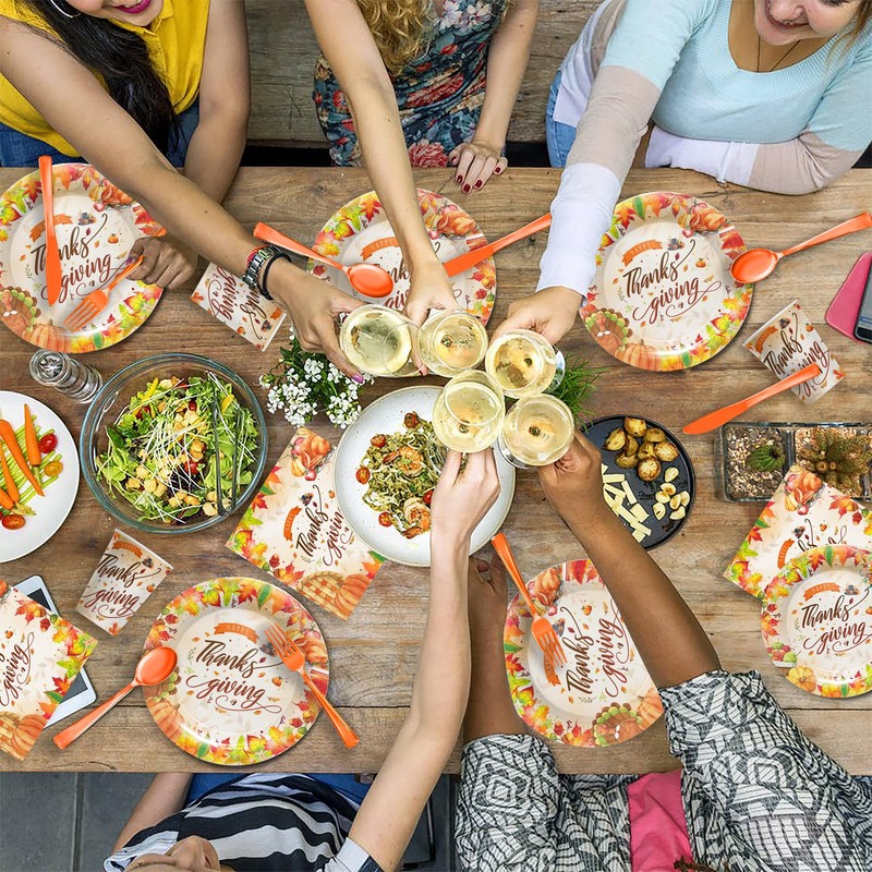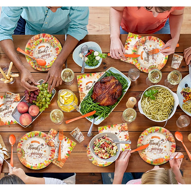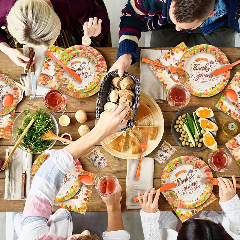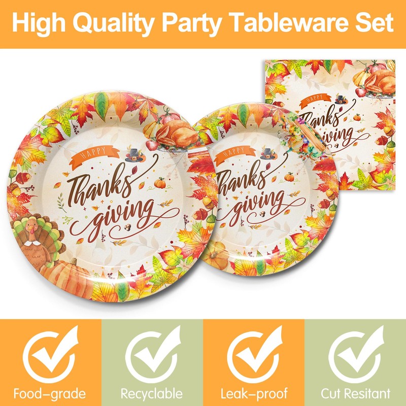• 【Thanksgiving Fall Party Supplies】This Thanksgiving theme party tableware set includes 24pcs 9'' dinner paper plates, 24pcs 7'' dessert paper plates, 24pcs napkins, 24pcs cups, 24pcs forks, 24pcs spoons, 24pcs knifees, for Thanksgiving autumn party supplies