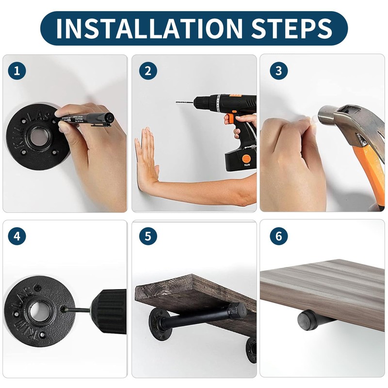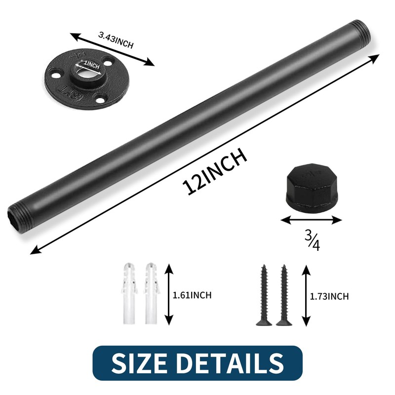 - Easy to Use and Install: This 3/4" industrial pipe shelf brackets comes with screws and wall expansion plugs. You can follow the installation steps in the image installation guide, and complete it in under ten minutes. The pipe length is 12 inches and can be mounted on a wooden board with a maximum width of 11.6 inches. Please carefully check the dimensions of your wooden board before purchasing to ensure a perfect fit for your shelf.