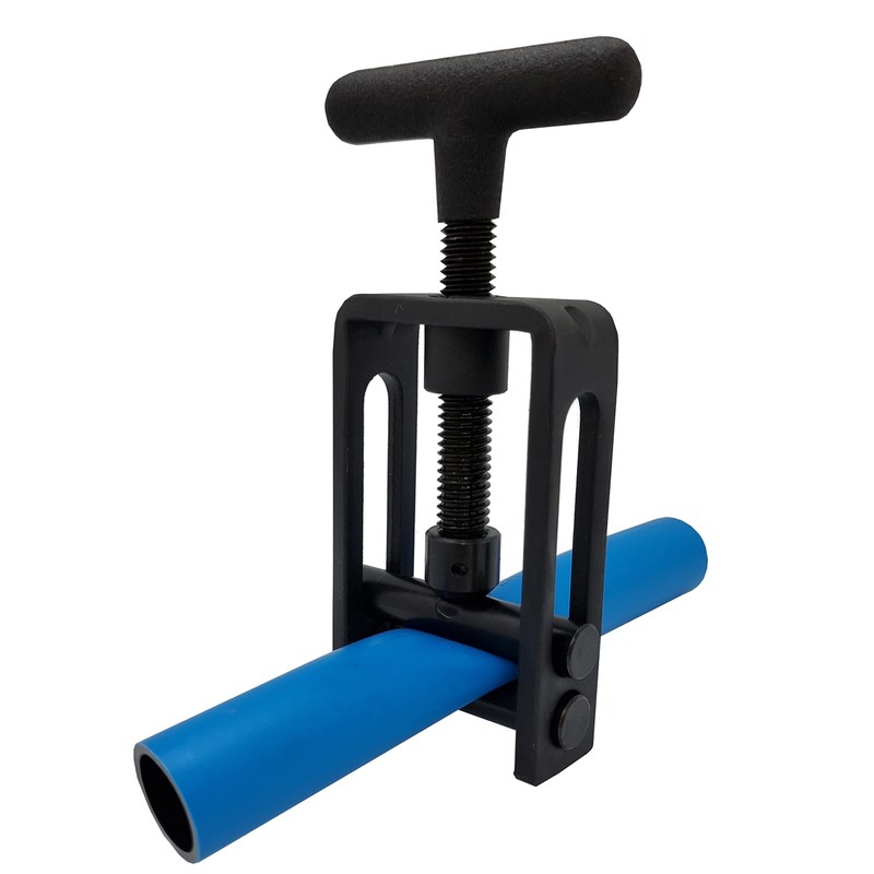 Clamping hand tool – Ideal clamping tool for MDPE plastic pipes. Can be used with pipes already in place, simply remove the lower bar, put the tool in place and then reinsert the lower bar to start clamping.