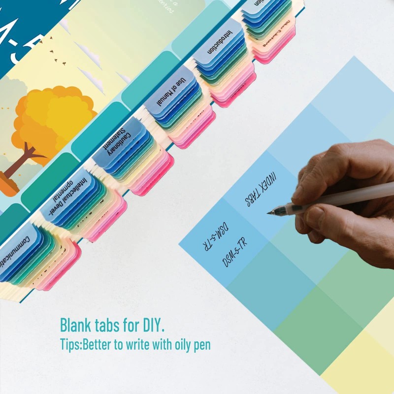 PACKAGE CONTENTS - There are 94Pcs preprinted DSM-5 TR index tabs, 18 Pcs pastel blank colored tabs, 2 sheeets of abbreviation cards, 1 agliment guide and 1 bookmark.