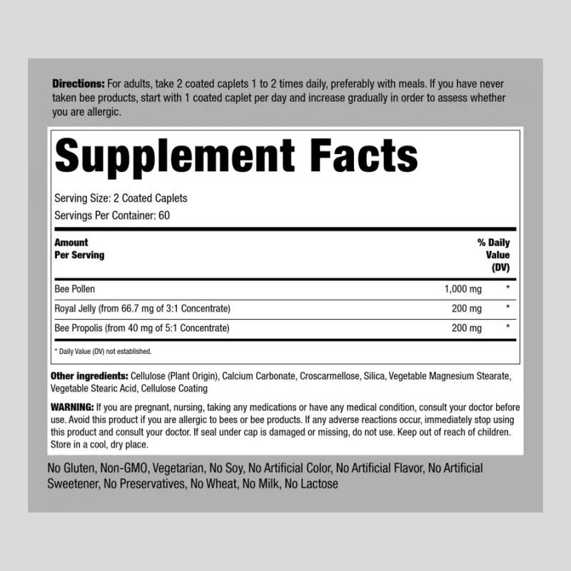 PipingRock has created a Supreme Bee Pollen Complex that utilizes innovative practices and advanced manufacturing. Our formula features a strong synergistic blend of Bee Pollen, Royal Jelly and Bee Propolis for maximum support! Coated Caplets make it easy to take on-the-go for any active lifestyle. Also, it’s Non-GMO, Gluten-Free and contains no Artificial Flavor, Artificial Sweetener or Preservatives. Perfect addition to any supplement regimen for Men & Women!