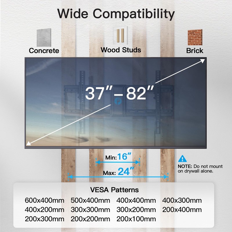 - Wide Compatibility: This tilting TV wall mount by Pipishell fits most 37″–82″ TVs up to 132 lbs with VESA mounting patterns 200x100 to 600x400mm. Please verify the size, weight, and VESA mounting pattern of your TV before purchase.