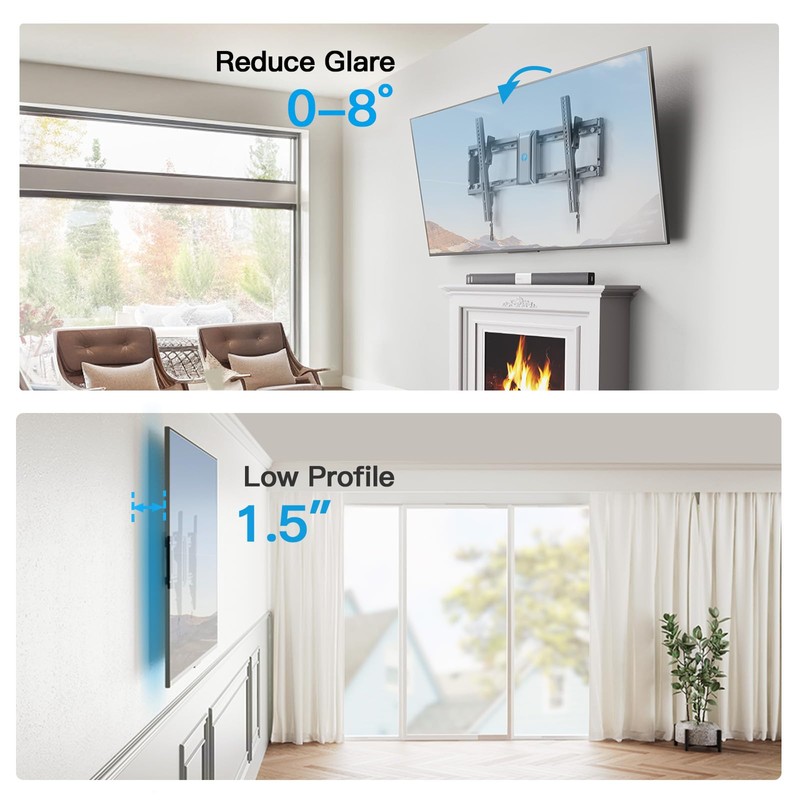 - Low Profile Look: This TV wall mount positions your TV only 1.5″ from the wall for a sleek, low-profile look. The 10° adjustable tilt angle helps to reduce screen glare from windows and other light sources for an optimal viewing experience.