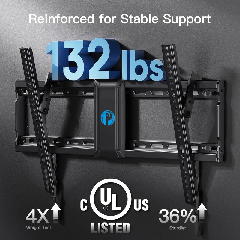 - Built for Stability: Engineered with reinforced, cold rolled steel, our TV wall mount features a remarkable weight capacity of 132 lbs. The TV wall mount bracket has been tested to support 4 times the rated weight capacity, ensuring ultimate peace of mind for your equipment.