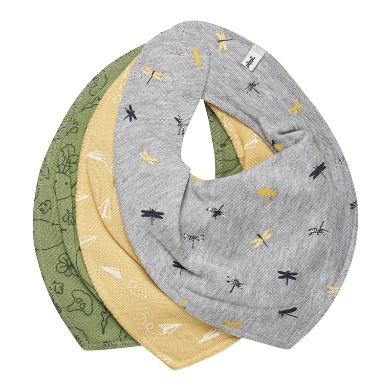 - Ideal for teething, drinking and eating but also ideal protection against the cold. The fashionable triangular scarves are available in three colours and with cute patterns.
