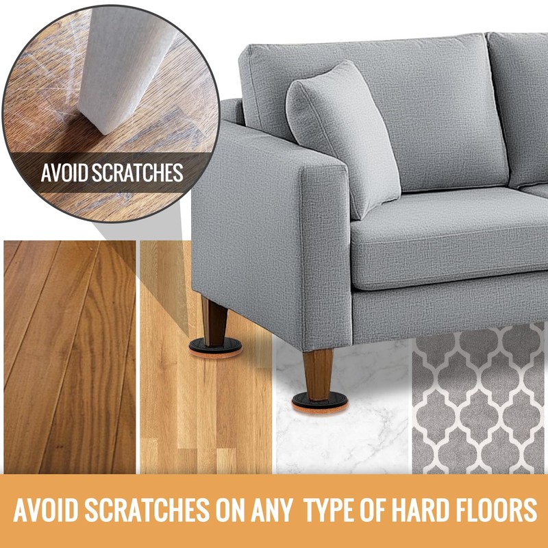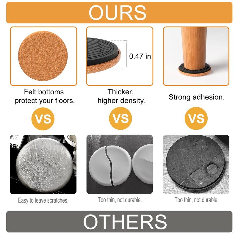• No ScratchesThe felt and EVA design allows for hassle-free gliding of even the heaviest furniture across hard floors. Perfect for rearranging furniture or moving it to clean underneath without scratching or scuffing your floors.