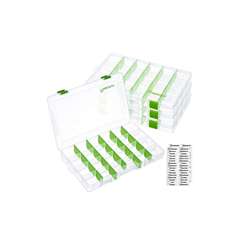 Piscifun Fishing Tackle Trays, Plastic Clear Fishing Storage Tackles Boxes with Waterproof Labels, 3700 Removable Dividers Storage Organizer Boxes, 4 Packs-Green