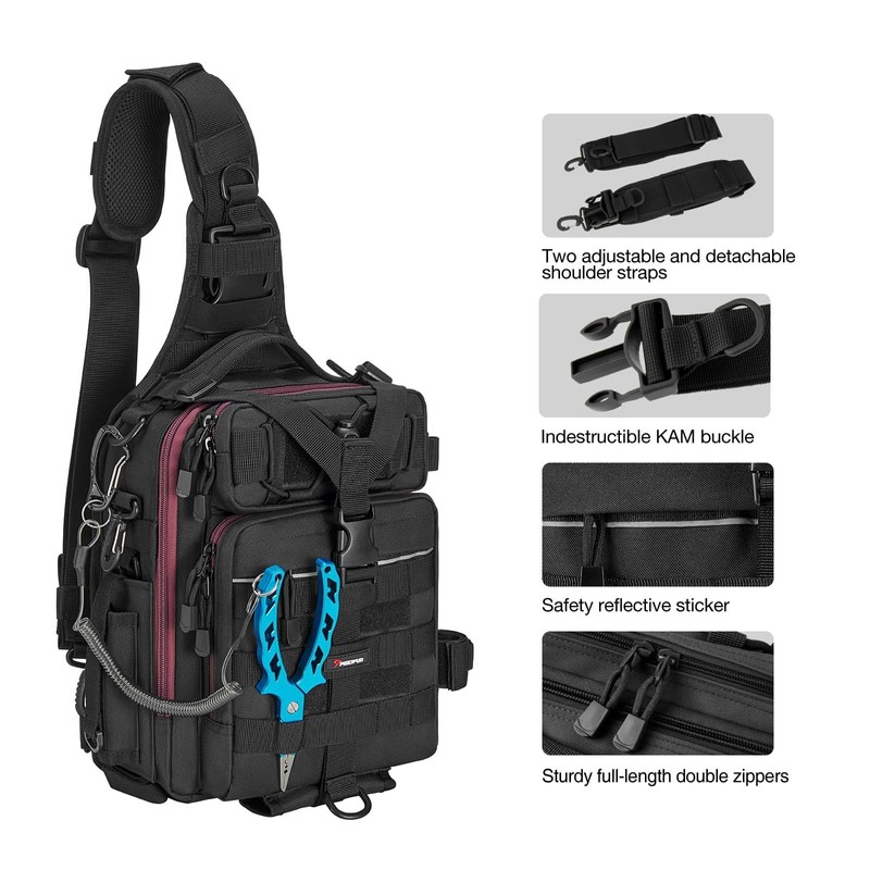 Piscifun Fishing Tackle Bag with Rod & Gear Holder, Lightweight Sling Tackle Storage Bag, Outdoor Shoulder Pack for Hiking, Hunting, Black