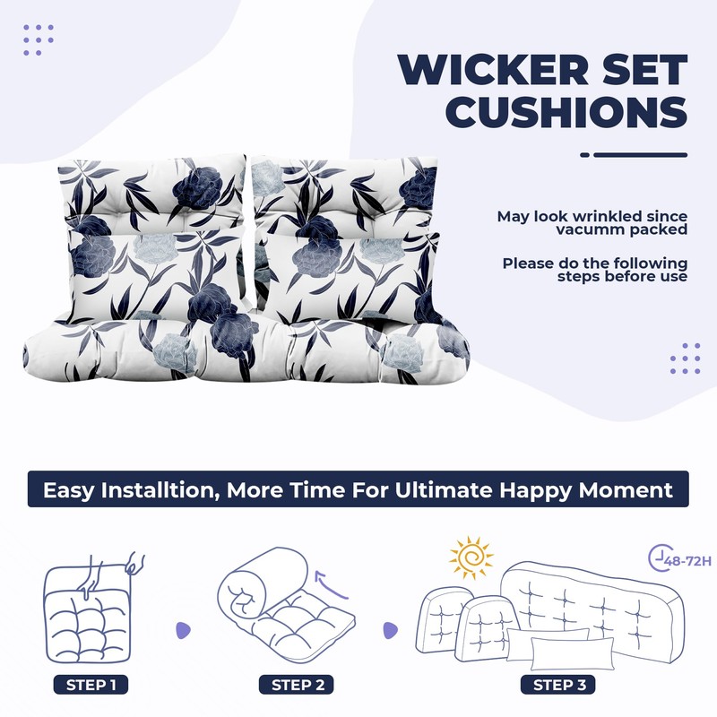 - 💦Package Tips: The outdoor wicker seat cushions set of 3 include one loveseat cushion 19" x 44", two U-Shape seat cushions 19" x 19" and two lumbar pillows 9.4"x19.7". Vacuum packaged for easy transportation, please patiently place it for 3-7 days to have better using experience