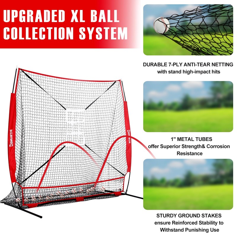 - 【7x7ft Baseball Net & XL Large Ball Collecting System】- Featuring dimensions of 7x7ft, perfect for practice hitting, pitching, batting, and fielding, offering an expansive catching area. In contrast to other pitching net with smaller pockets, our softball net comes equipped with an XL large ball collecting system, ensuring all balls stay inside after impact,avoid time waste in chasing the mistarget balls, allowing you to focus on improving your technique.