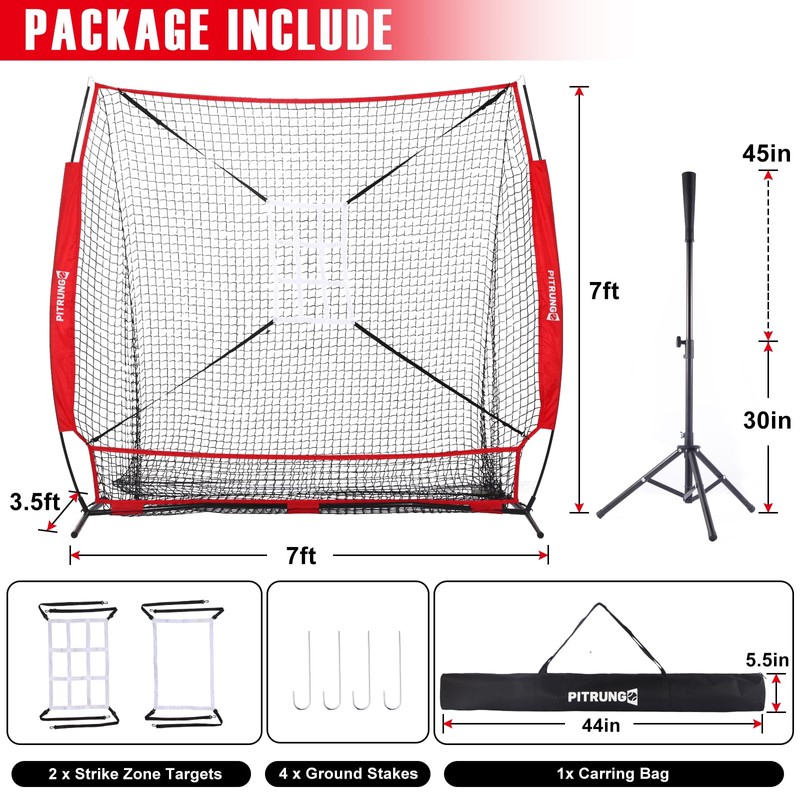 Pitrungo 7x7ft Baseball Softball Practice Net w/Large Ball Collection System Pitching Net w/Tripod Adjustable Batting Tee 2 Strike Zone Carry Bag Baseball Nets for Hitting Pitching