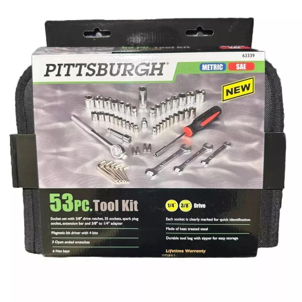 PITTSBURGH 53-Piece Mechanics Tool Set Kit Metric & SAE Wrenches Socket Ratchet With Case