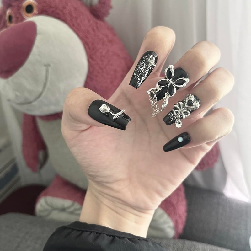 PIVHWIR Press On Nails,15 PCS Reusable Glossy Long Fake Nails, 3D Butterfly Design Press On Nails, Stick On Nails, Rhinestone Fake Nails-Black (S)