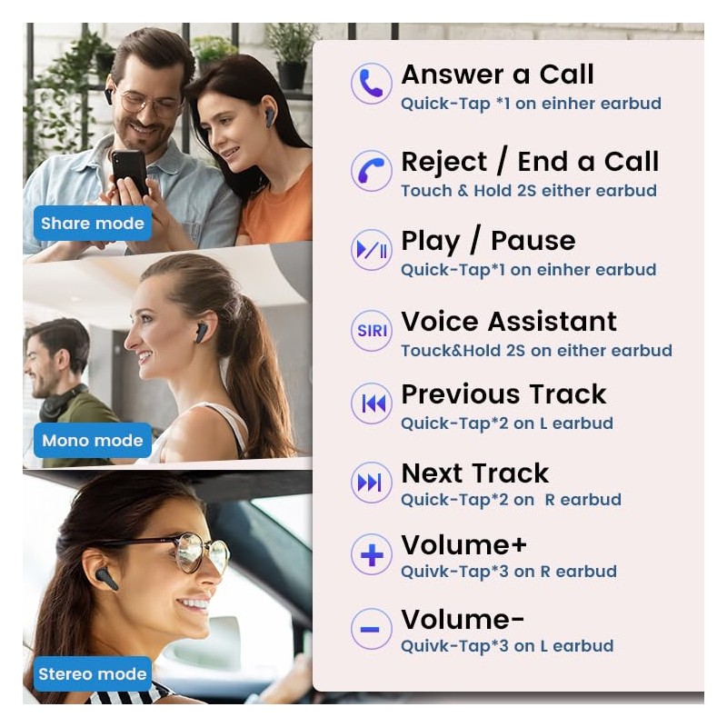 - [Smart Touch Controls and Wide Compatibility]: Bluetooth headphones in ear with high sensitivity touch technology, and it can help you easily achieve multiple functions, including play/pause, answer/reject phone, volume adjustment, switch music, activate voice assistant, etc. Wireless headset are compatible with most Bluetooth music players including cellphones, tablets, computers, TV, etc.