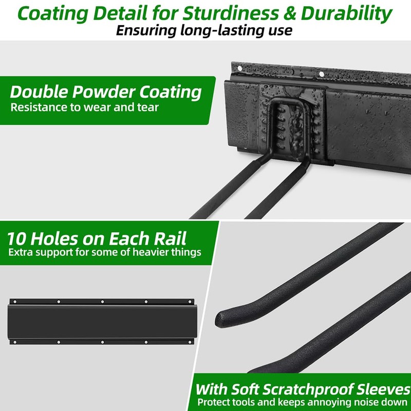 - Sturdiness & Durability: The garage organizers crafted from heavy-duty alloy steel materials, ensuring long-lasting use and resistance to wear and tear, and holds up to 360LBS. Give 10 holes on each strip, extra support for some of heavier things