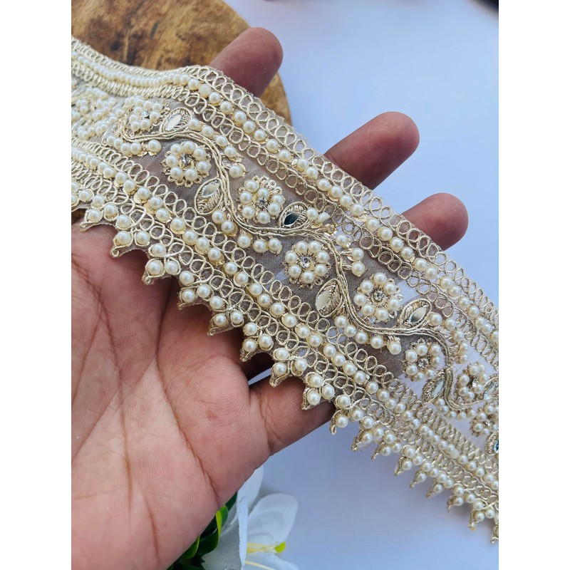PIYUCRAFTS Mirror Pearl Zircon Flower Trim – 2.5 Inch Wide Decorative Border for Sarees, Dresses, Dupattas, Crafts | Handmade Lace | Available in 1, 3, 6 Yard (1)