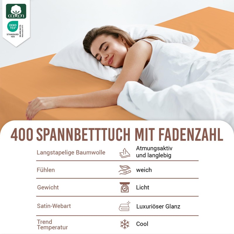 Pizuna 400 Cotton Fitted Sheet 80 x 200 - 90 x 200 cm Apricot Orange, 100% Long Cotton Fitted Sheet, Soft Mako Satin Fabric for up to 40 cm Mattress Height (100% Cotton Bed Sheet)