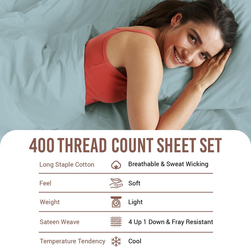 - Skin-friendly, Cool & Smooth: Crafted from 100% Long-Staple Combed Cotton Sateen Weave, these 400 thread count bed sheets set king size with their lightweight texture is made with specially compacted yarn. Minimal artificial processing make these king bed sheets set gentle on all skin types, prevents night sweats, absorbs moisture and regulates body temperature to sleep cool while maintaining the elegant hotel look.