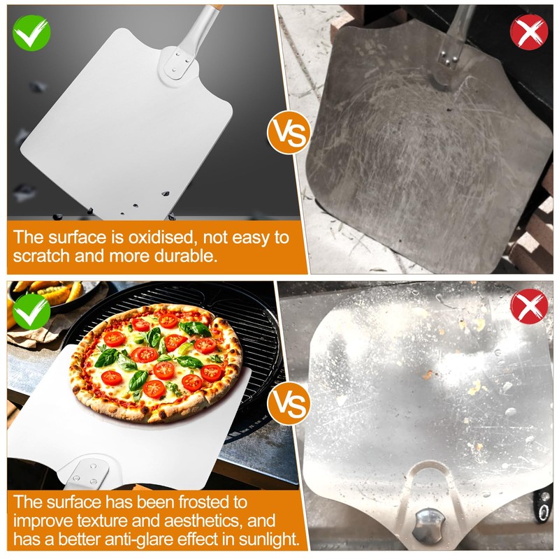 - 【Excellent material】 : The metal pizza peel is made of high-quality aluminum, and the surface is oxidized by process. This film can effectively protect the surface of aluminum, significantly improve its corrosion resistance and the hardness and wear resistance of aluminum, increase the surface brightness and beauty, and extend the service life.