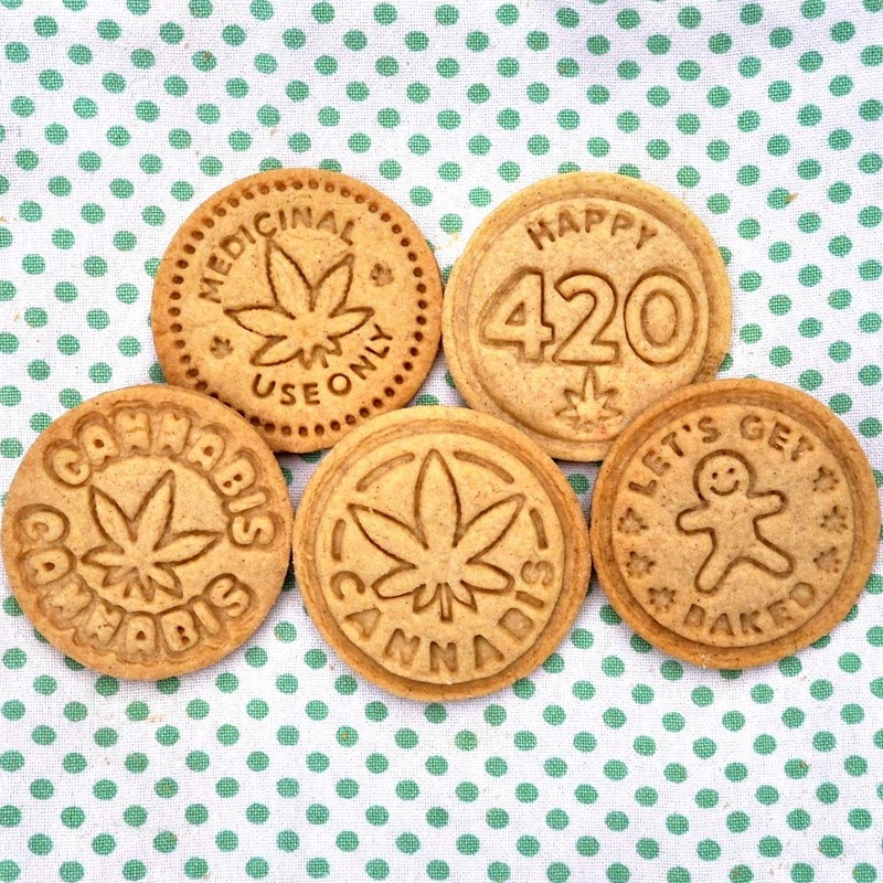 PJ BOLD - Sellos de silicona para galletas de marihuana, cortador de galletas de acero inoxidable, mango de madera, regalo de fiesta, juego de 6 sellos