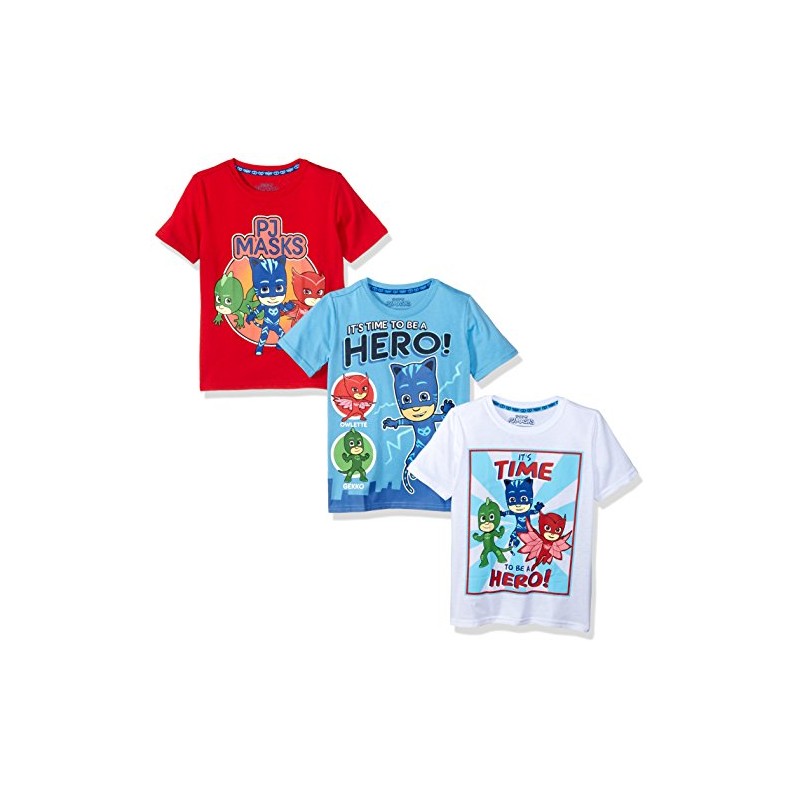 - Fun Designs: Blue and white T-shirts have a "It's Time To Be A Hero" print with Owlette, Catboy, and Gekko. Red T-shirt also has a PJ Masks print with Catboy, Gekko, and Gekko at the ready