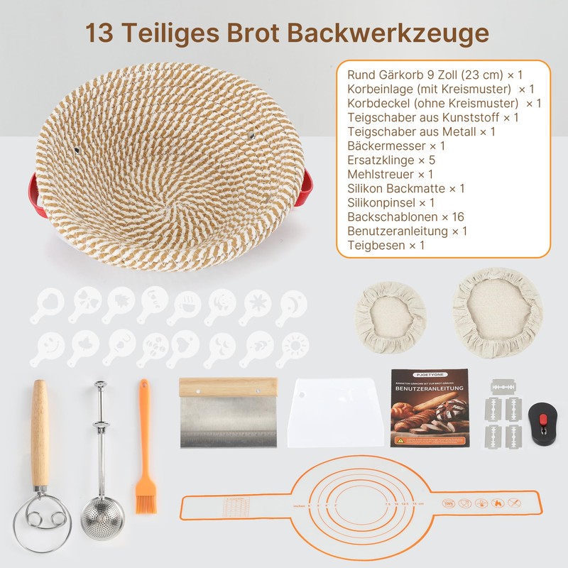 - ZUBEHÖR ENTHALTEN: Rund Gärkorb 9 Zoll (23 cm) × 1, Korbeinlage (mit Kreismuster) × 1, Korbdeckel (ohne Kreismuster) × 1, Teigbesen × 1, Bäckermesser × 1, Ersatzklinge × 5, Teigschaber aus Kunststoff × 1, Teigschaber aus Metall × 1, Mehlstreuer × 1, Silikon Backmatte × 1, Silikonpinsel × 1, Backschablonen × 16, Benutzeranleitung × 1