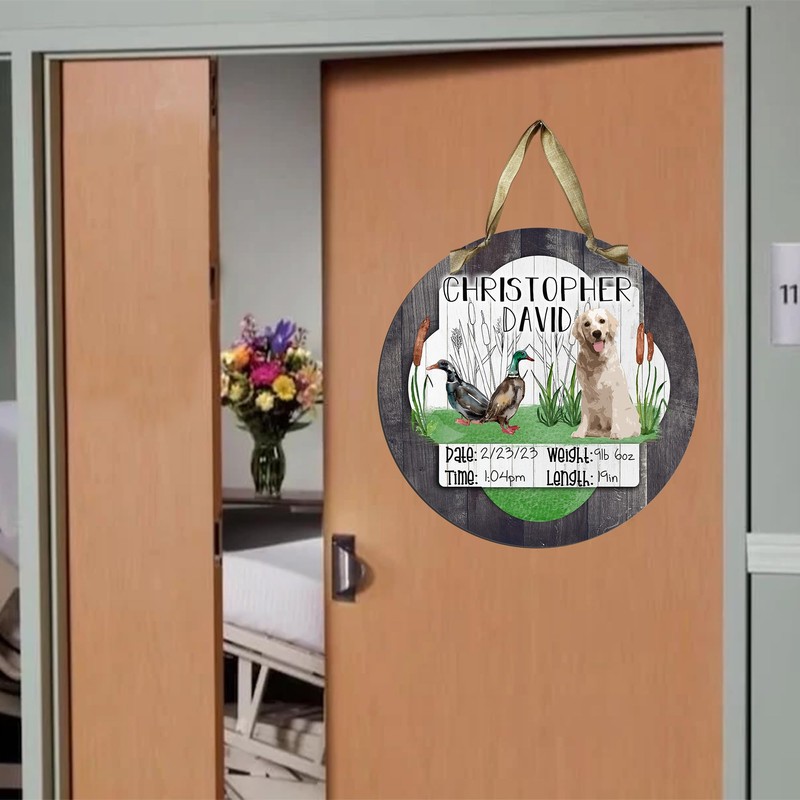 PK Décor Customizable Duck Hunter Baby Announcement Sign Plaque, Dog Lover Baby Shower Gift, Yellow Lab Man’s Best Friend Decoration