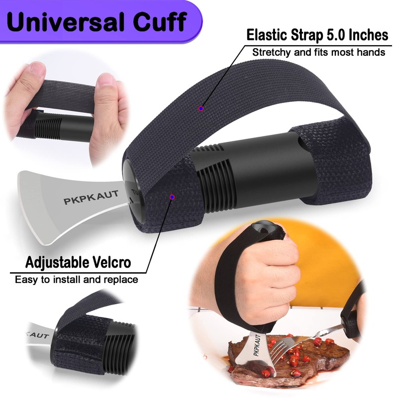 - Universal Cuff – Oxford webbing. Built up knife elastic hand strap 4.5 inches, stretchy and fits most hands, adjustable velcro easy to install and replace, adaptive utensils holder provides ease holding for elderly with little or no hand strength.
