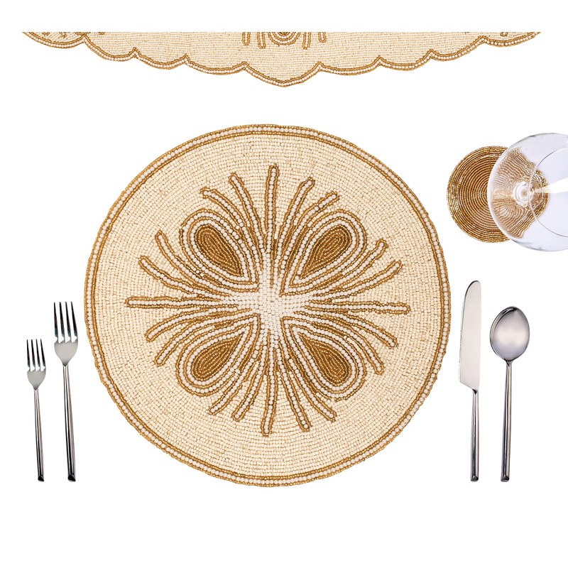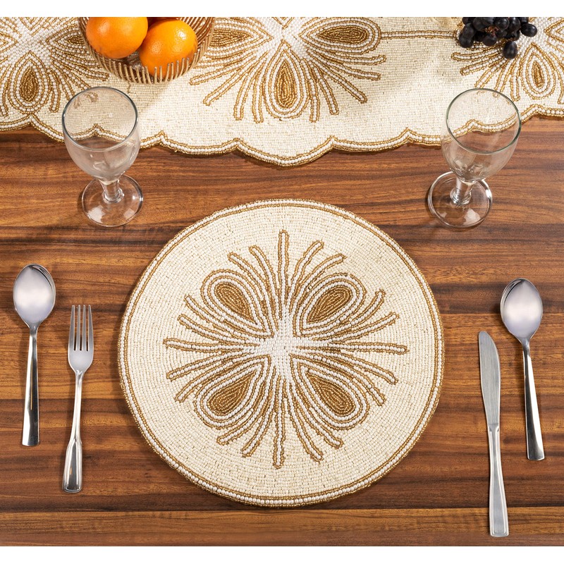 Placemats Hand Embroidered Beaded Mats - Measures 13 Inches, Beaded Round Ivory & Gold Placemat for Dining Table, Family Parties and Celebrations Durable Placemats
