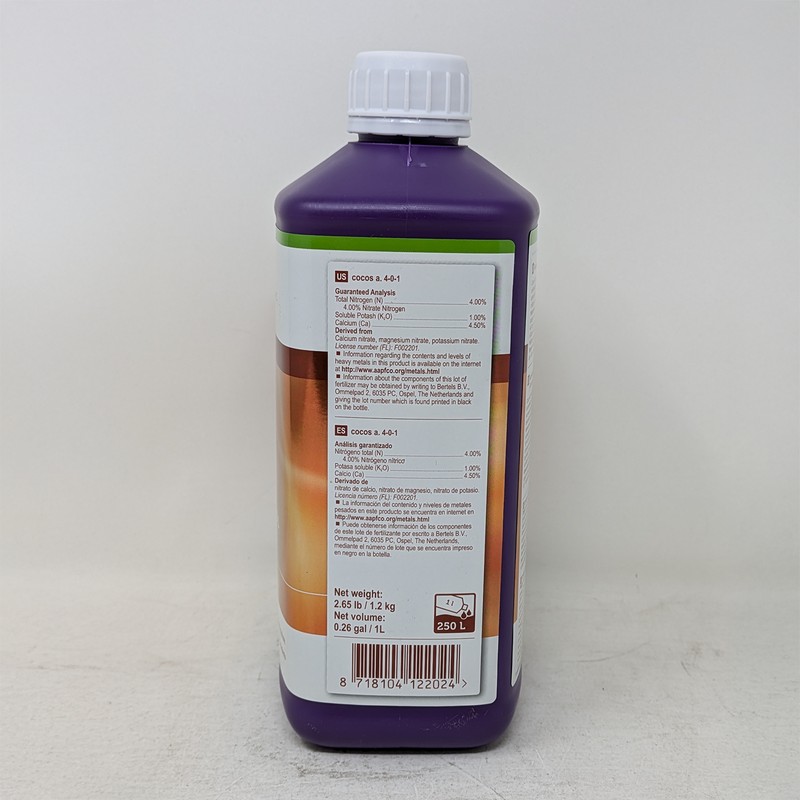 This liquid fertilizer is easy to use and formulated for optimum results. Cocos A contains calcium while Cocos B contains phosphorus. These elements are known to bind to each other and crystalize, or 'precipitate'. When these elements precipitate, the nutrients are no longer available for the plant to absorb and use. However, when both nutrients are added to water separately, the solution is diluted so that calcium and phosphorus are no longer precipitated and the nutrients remain available to the plants. Thus, a two-part system for maximum absorption of these nutrients was developed.