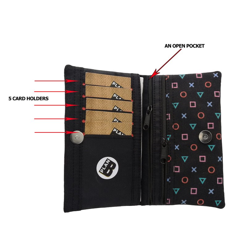 Plan B, Compact Play Purse 15 x 9 cm with 5 Card Slots Symbol of the Game on Black Background Women Fabric, Black with play symbols, M, Modern