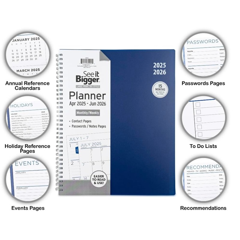 - ✅ Put your reading glasses away! The See it Bigger collection’s, 15-month, monthly and weekly dated planner with large, easy-to-read type also has plenty of room to jot down all of your events, notes, tasks, and other relevant information. Individual monthly tabs allow for quick access to separate monthly calendars that open flat in side-by-side pages for simple retrieval and entering of information.
