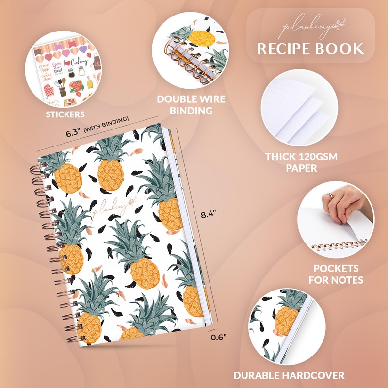 PLANBERRY Recipe Book – Blank Hardcover Cookbook to Write in Your Own Recipes – Empty Cook Book Journal to Fill in – Blank Family Recipe Notebook – 60 Recipes, 6.3”x8.4” (Pineapple)