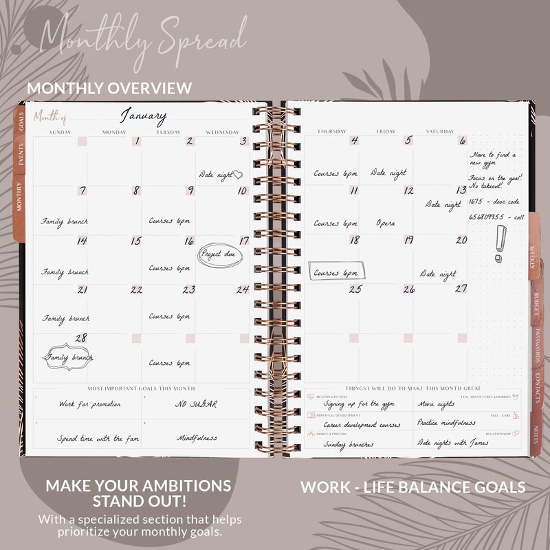 - ✓ MAKE YOUR GOALS & DREAMS A REALITY – With this personal organizer you will be able to not only plan your schedule and budget, but also set and achieve goals, and work towards making your dreams an attainable reality. We will provide you with an instrument to build a happier and more fulfilled life, develop new healthy habits, and improve your overall well-being. Every day, week, and month you will be prompted to learn and use new tools for becoming happier, healthier, and more successful.
