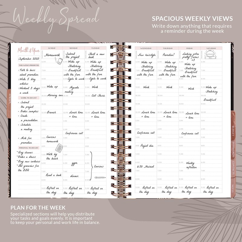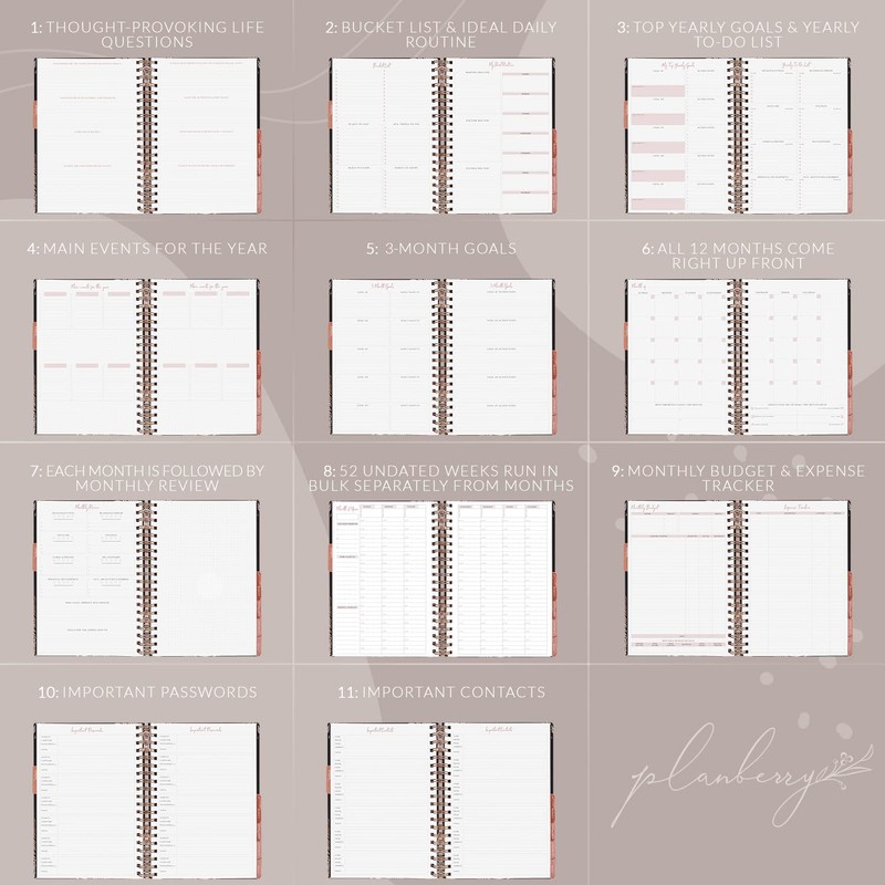 - ✓ SCHEDULE & BUDGET PLANNER IN ONE - PLANBERRY Weekly Schedule Planner will help you take control of your schedule and budget to achieve your goals and always be one step ahead. It is a unique all-in-one tool that incorporates a detailed weekly time management planner with time slots, and a comprehensive monthly budget planner. Moreover, there is a yearly goals section, an events calendar, password and contact books, and many other tools to help you live every day to the fullest.