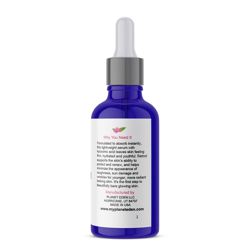 - Planet Eden's Retinol Serum Improves hydration to dry skin with Hyaluronic Acid * Gently improves dull skin by removing dead skin with Retinol * Gradually reveals more luminous skin with nightly use * No harsh chemicals, cruelty free and made in the USA * Rose and lemon peel extracts tone and enliven skintone * Improves the look of wrinkles/fine lines * 2.5% is the highest allowed retinol percentage, will work better than 1% concentrations